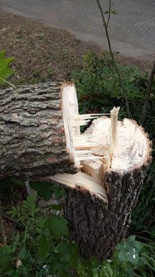 Of course I had to get in on the action too. This tiny sweet gum tree was growing in the driveway, I've wanted to take it down for years. And of course I recently got hooked on arborist videos on youtube, so I had to try a new technique for me. A humboldt notch is when you undercut the tree in the direction you wanted it to fall. It's apparently very popular on the west coast. I made the initial cut back too deep, then the notch cutout wasn't deep enough so my back cut didn't leave the hinge wood in the right place. Fortunately a 5" diameter tree is an easy enough place to make this rookie mistake.